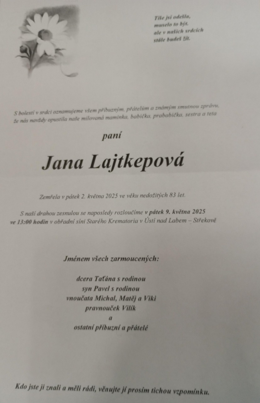 S lítostí sdělujeme, že dnes v noci zemřela dlouholetá předsedkyně místní organizace č. 7 - Neštěmice paní Jana Lajtkepová.